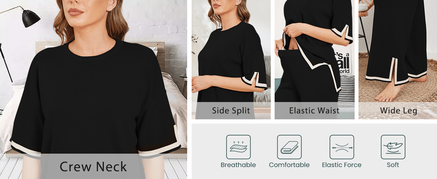 It features a crew neck, long/short sleeve, side split hem, and wide leg pants with elastic waistband, loose fit that fits any body size.